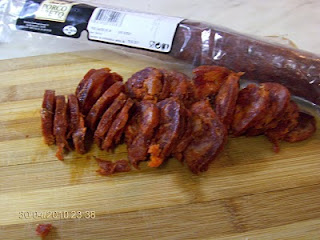 Corte o chouriço ás rodelas. Para esta receita escolhi um bom chouriço de porco preto com pouca gordura. Quanto melhor for o chouriço mais gostosos ficarão os pãezinhos.