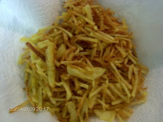 2. Descasque as batatas, corte-as em palitos muito finos (tipo batata palha) e frite-as em óleo quente. Reserve.